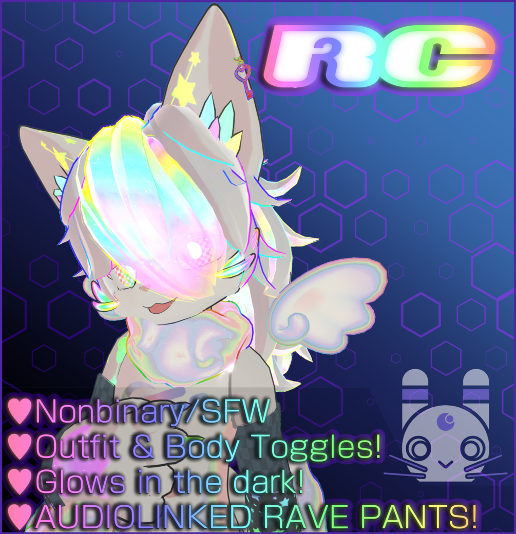 A colorful little chaotic-good angel gremlin, RC is a bright & bouncy raver here to lighten up your lobby!