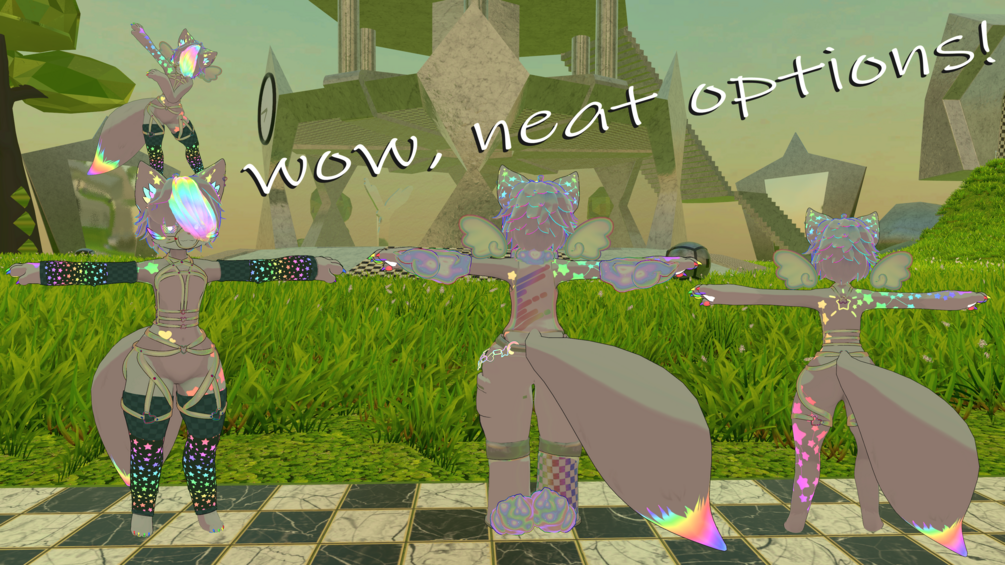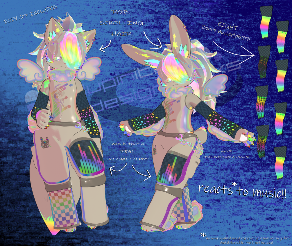 While not a complete nuke to performance, this avatar is rated as Very Poor with 127,230 polygons and 128mb of texture memory usage. The many images and masks included are high res and the avatar is built to be flashy over being performant. This shouldn’t pose any problems to anyone other than users on potato PCs, but if you experience problems you can lower the import resolution of included images.